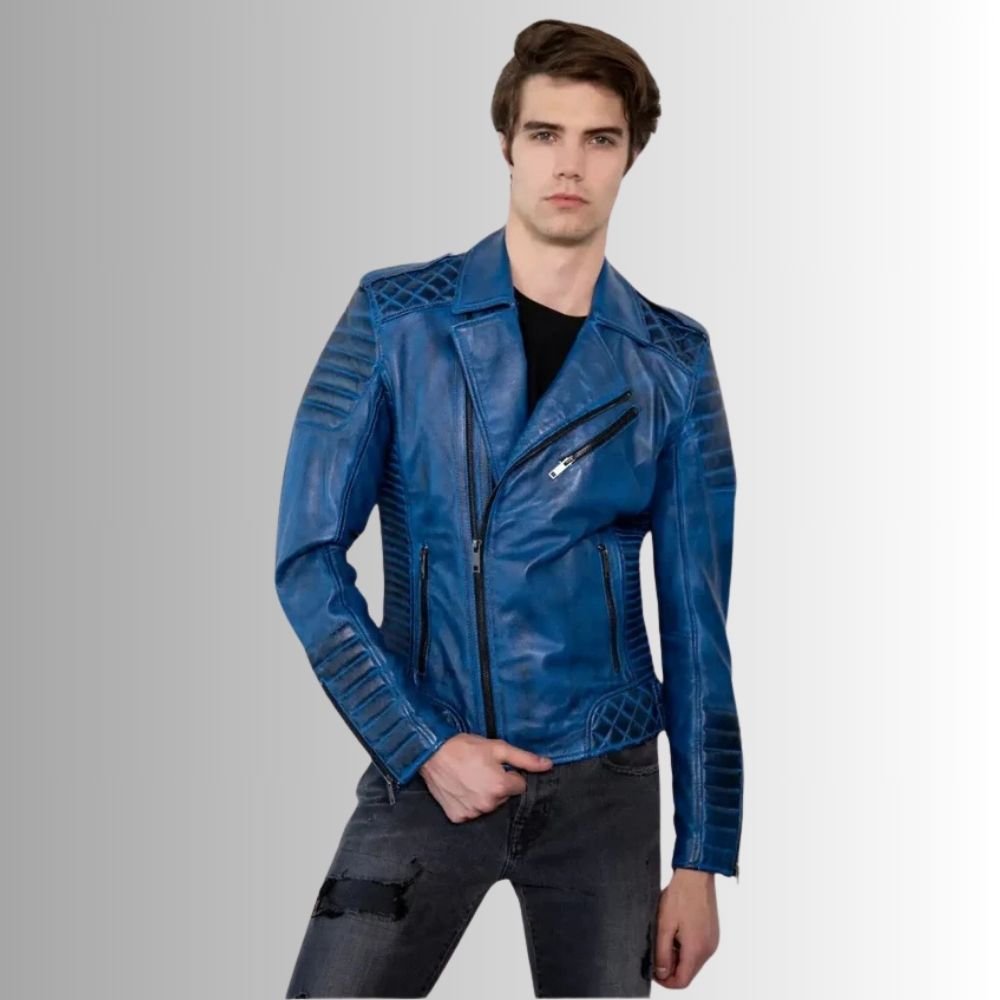Add a pop of color and edge to your wardrobe with our Blue Leather Moto Jacket. Crafted from high-quality genuine leather, this jacket combines bold blue hues with a sleek, modern design. The slim-fit cut provides a flattering shape, while the durable leather ensures lasting wear. Perfect for motorcycle enthusiasts or anyone looking to elevate their everyday look, this jacket offers a stylish way to stay comfortable and on-trend. Whether you’re hitting the road or stepping out with friends, this jacket is sure to turn heads.”