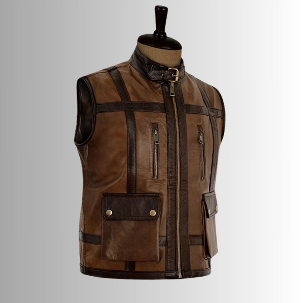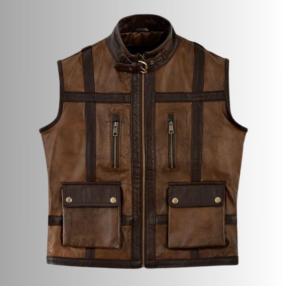 Featuring a bold strapped collar and a secure zipper closure, this vest is as functional as it is stylish. With four external pockets (two side and two zippered breast pockets) and an inside pocket, you’ll have plenty of space for essentials. The dark brown color gives it a classic, versatile look that’s perfect for any occasion.