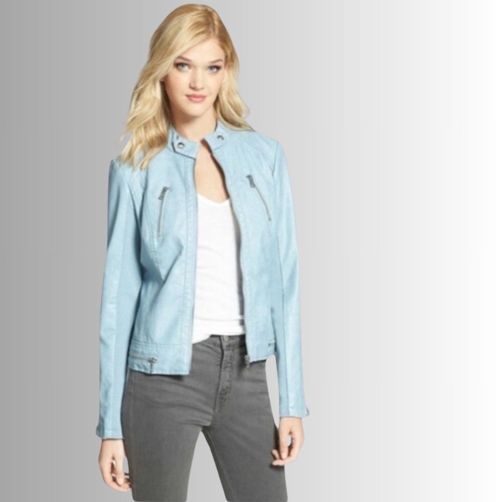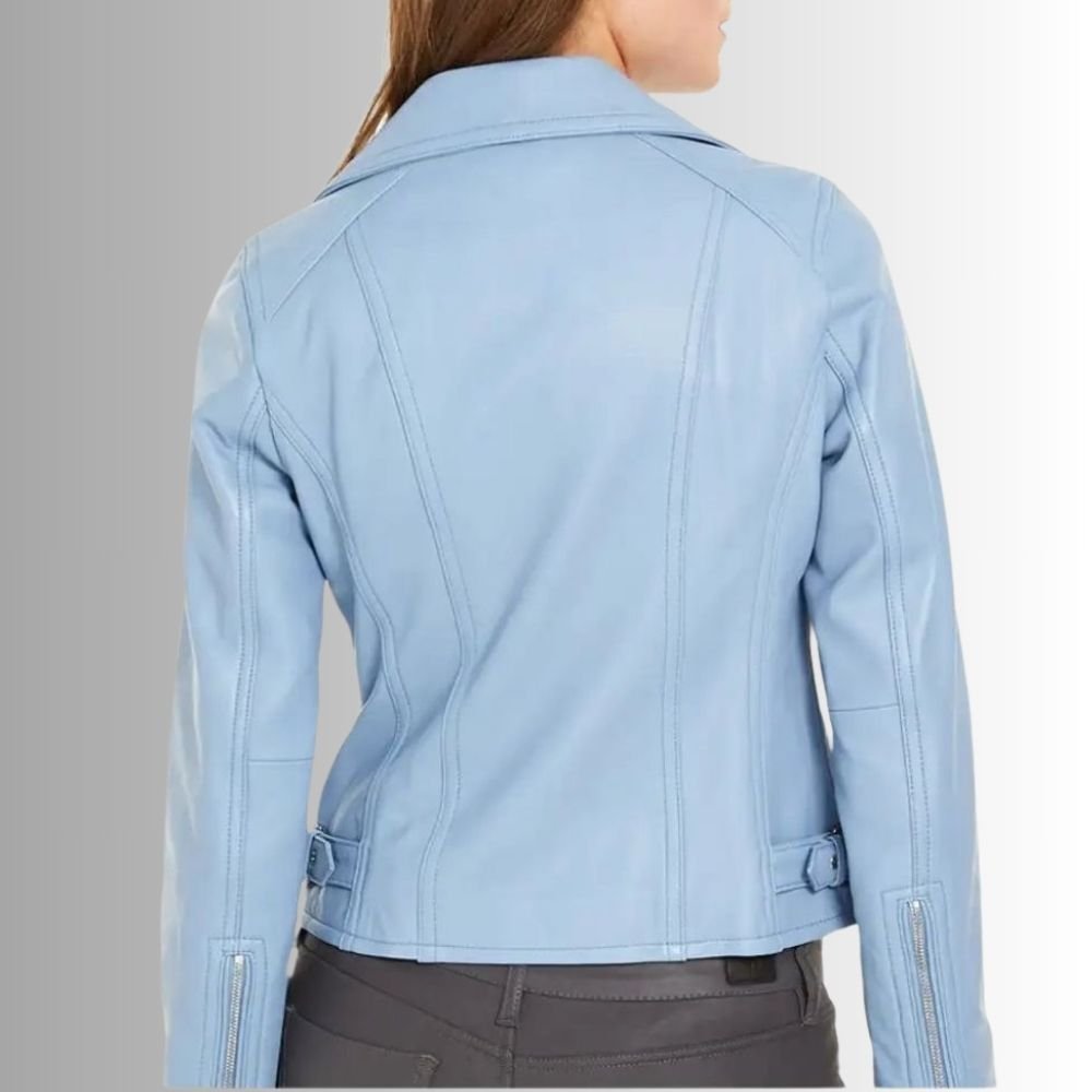 Elevate your wardrobe with this light blue leather jacket for women, the perfect blend of modern elegance and edgy style. Crafted from premium faux leather, this jacket boasts a sleek moto-inspired design, featuring a flattering cropped fit and silver-tone hardware for added sophistication. The pastel blue hue makes it a standout piece, ideal for spring or transitional weather. Whether paired with casual denim or a chic dress, this jacket brings effortless style to any outfit.