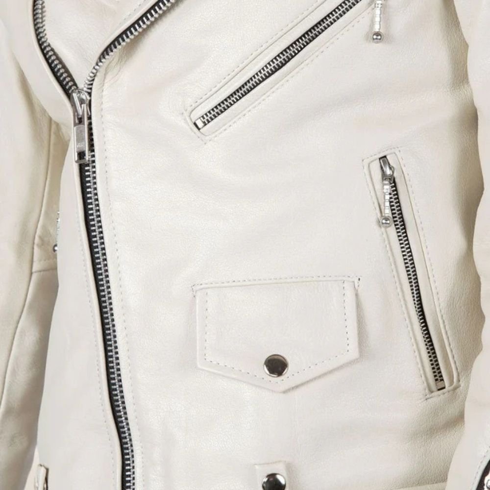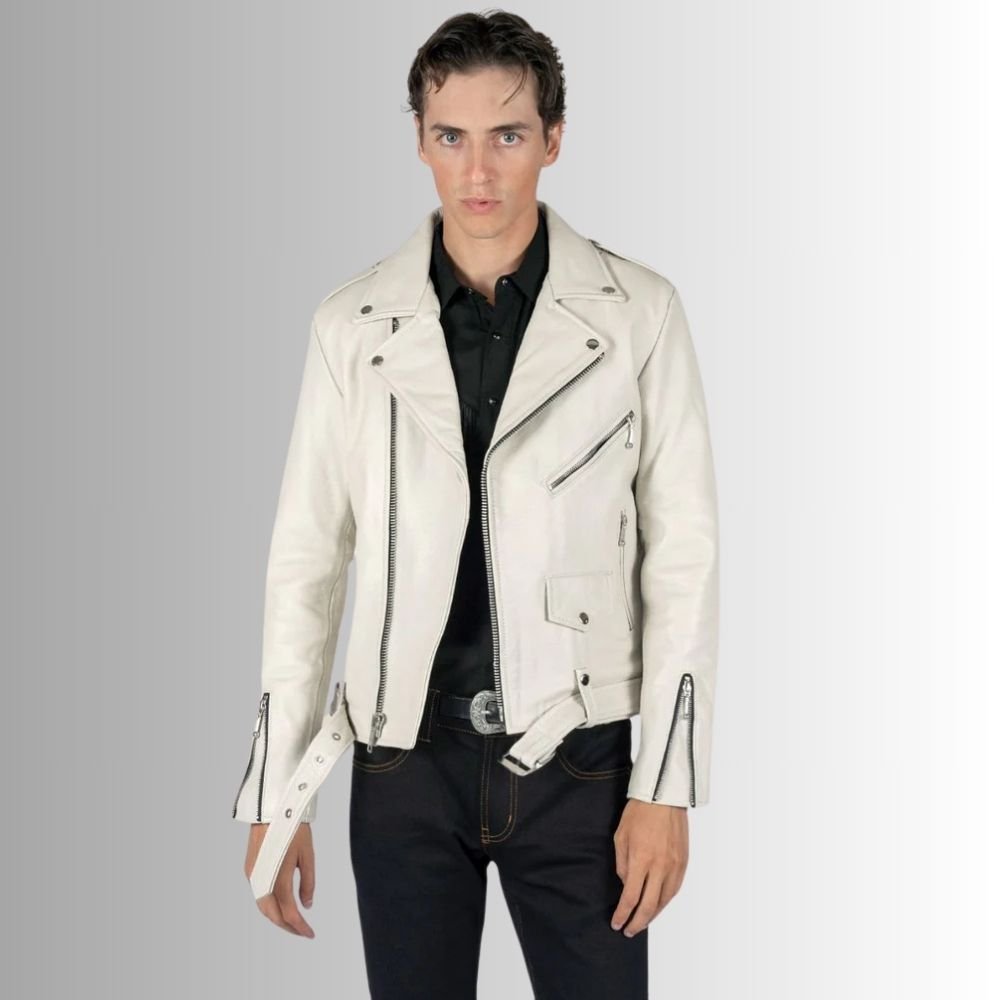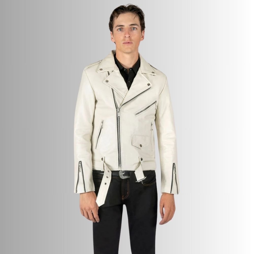 Elevate your style with our Mens White Leather Biker Jacket . Crafted from premium-quality leather, this jacket is designed to deliver a perfect balance of durability, comfort, and timeless appeal. Its sleek design and attention to detail make it the ideal choice for motorcycle enthusiasts and fashion-forward individuals alike. Whether you’re hitting the road or stepping out in style, this white biker jacket will turn heads and keep you feeling confident.